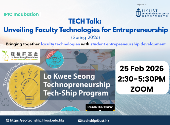 As part of the IPIC Incubation, Tech-Ship Program is a platform leveraging the wealth of research talents and outcomes at HKUST to bridge together faculty technologies and student entrepreneurship, the "TECH Talk: Unveiling Faculty Technologies for Entrepreneurship" (TECH Talk) will invite faculty members to introduce their technologies to students who are passionate about exploring technology entrepreneurship opportunities.